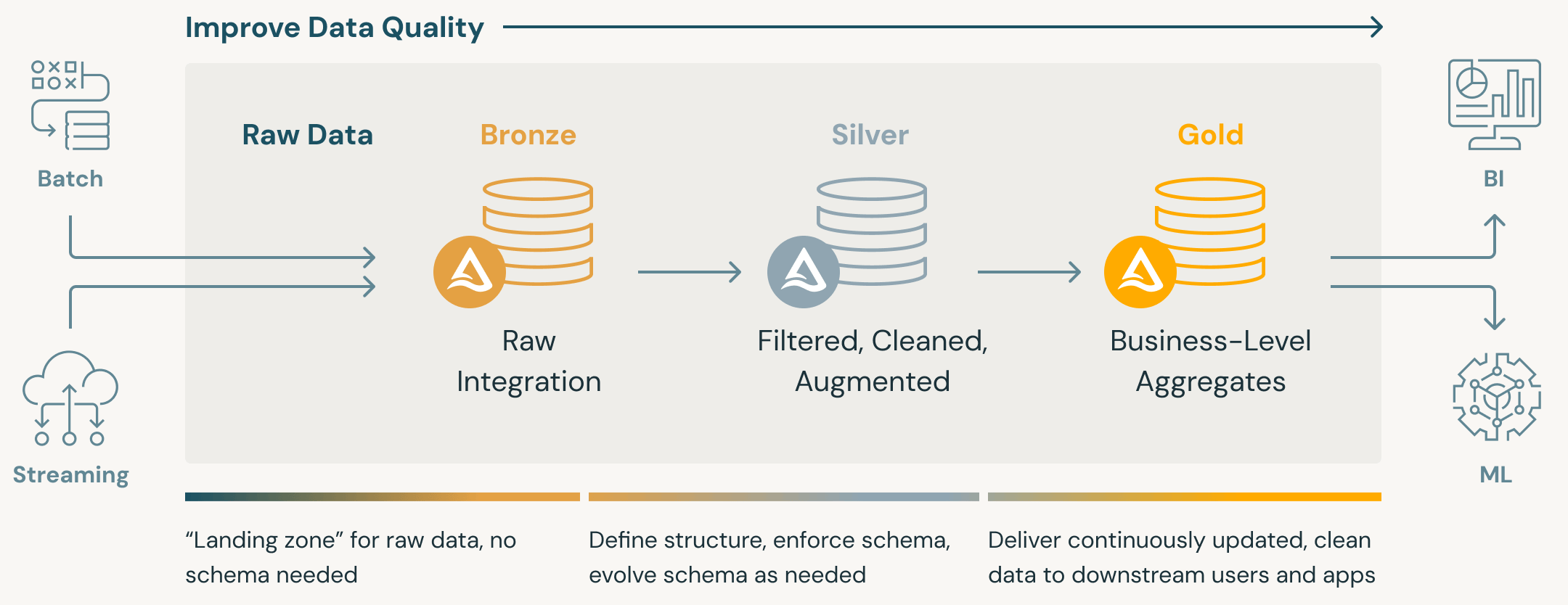 - Compatible with the concept of a data mesh. Bronze and silver tables can be joined together in a “one-to-many” fashion, meaning that the data in a single upstream table could be used to generate multiple downstream tables