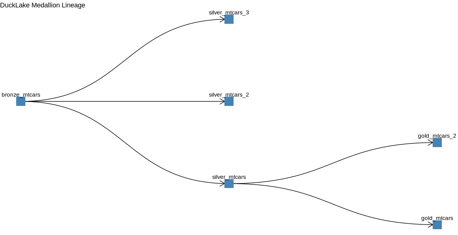 dbExecute(con, " INSERT INTO ducklake_lineage (parent_table, child_table, created_at, description) VALUES ('bronze_mtcars', 'silver_mtcars_2', NOW(), 'normalization / filtering'); ") dbExecute(con, " INSERT INTO ducklake_lineage (parent_table, child_table, created_at, description) VALUES ('bronze_mtcars', 'silver_mtcars_3', NOW(), 'normalization / filtering'); ") dbExecute(con, " INSERT INTO ducklake_lineage (parent_table, child_table, created_at, description) VALUES ('silver_mtcars', 'gold_mtcars_2', NOW(), 'aggregation'); ")- This is done after creating 2 more silver tables and 1 more gold table