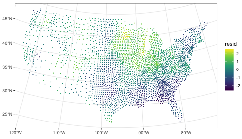 libary(ggplot2) data("US_counties_centroids", package = "SpatialInference") spuriouslm <- fixest::feols( noise1 ~ noise2, data = US_counties_centroids, vcov = "HC1" # robust SEs ) spuriouslm #> OLS estimation, Dep. Var.: noise1 #> Observations: 3,108 #> Standard-errors: Heteroskedasticity-robust #> Estimate Std. Error t value Pr(>|t|) #> (Intercept) 6.890000e-16 0.017872 3.860000e-14 1.0000e+00 #> noise2 8.738022e-02 0.015535 5.624836e+00 2.0216e-08 *** #> --- #> Signif. codes: 0 '***' 0.001 '**' 0.01 '*' 0.05 '.' 0.1 ' ' 1 #> RMSE: 0.996015 Adj. R2: 0.007316 US_counties_centroids$resid <- spuriouslm$residuals ggplot(US_counties_centroids) + geom_sf(aes(col = resid), size = .1) + theme_bw() + scale_color_viridis_c()noise1 and noise2 are independent of each other but spatially coorelated. This leads to an inflated t-value and low p-value.