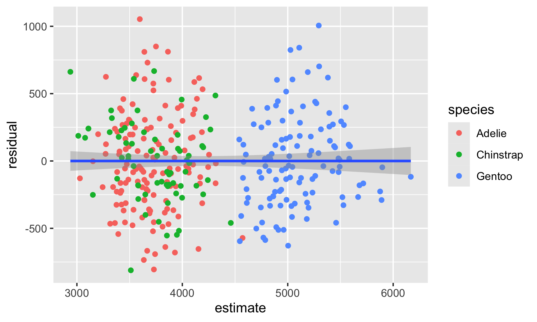 library(tidyverse) # For ggplot, dplyr, and friends library(parameters) # Extract model parameters to data frames library(marginaleffects) # Easier model predictions penguins <- penguins |> drop_na(sex) model1 <- lm( body_mass ~ bill_len + flipper_len + species, data = penguins ) fitted_data <- predictions(model1, newdata = penguins) |> mutate(residual = body_mass - estimate) ggplot(fitted_data, aes(x = estimate, y = residual)) + geom_point(aes(color = species)) + geom_smooth(method = "lm")Solutions: