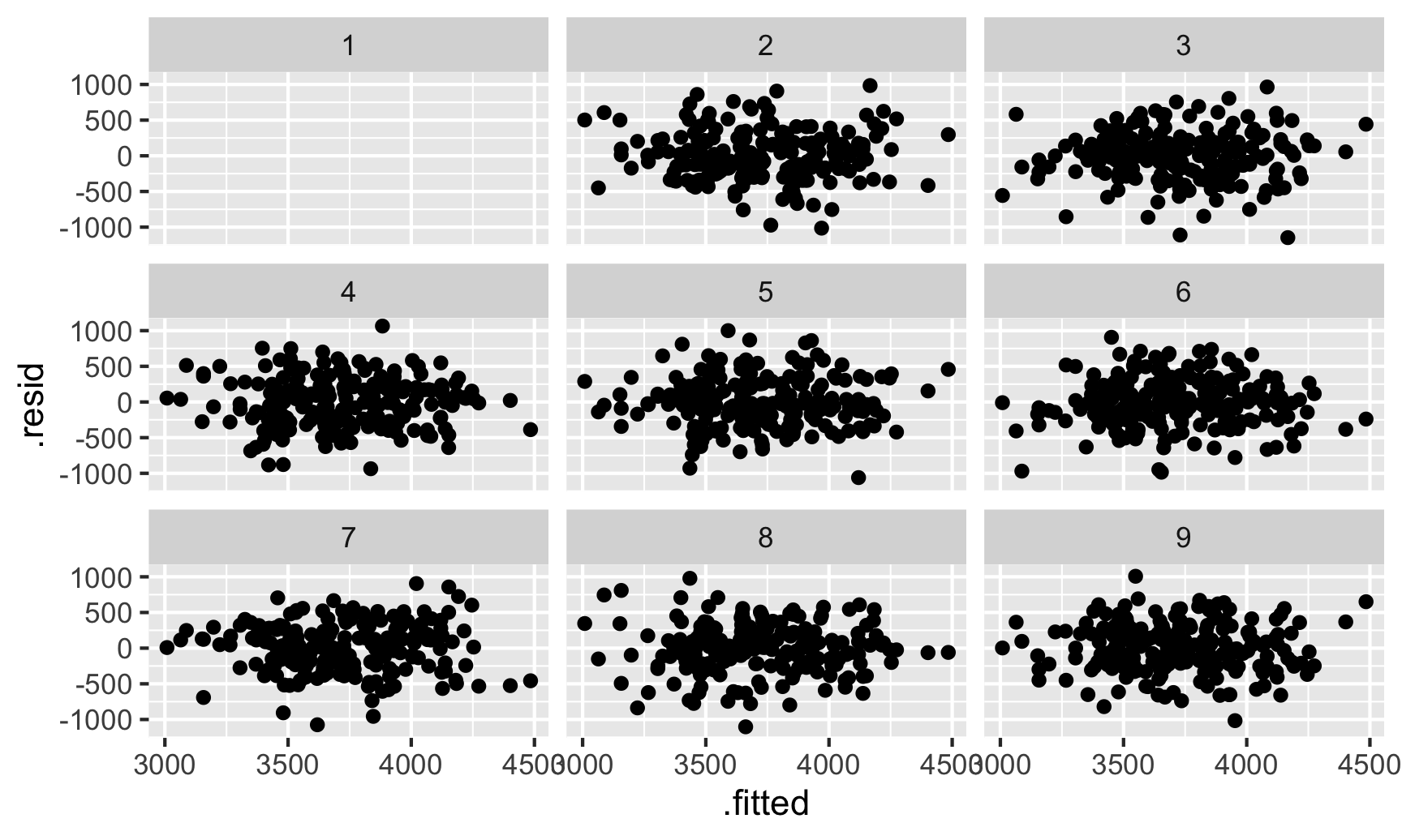 library(nullabor) set.seed(1234) penguins <- penguins |> drop_na(sex) # remove gentoo species and fit model ata_no_gentoo <- penguins |> filter(species != "Gentoo") |> mutate(species = fct_drop(species)) model_no_gentoo <- lm( body_mass ~ bill_len + flipper_len + species, data = data_no_gentoo ) fitted_sans_gentoo <- predictions( model_no_gentoo, newdata = data_no_gentoo ) |> mutate(residual = body_mass - estimate) shuffled_residuals <- lineup( null_lm(body_mass ~ bill_len + flipper_len + species, method = "rotate"), true = fitted_sans_gentoo, n = 9 ) ggplot(shuffled_residuals, aes(x = .fitted, y = .resid)) + geom_point() + facet_wrap(vars(.sample)) decrypt("sD0f gCdC En JP2EdEPn ZZ") ## Warning in decrypt("sD0f gCdC En JP2EdEPn ZZ"): NAs introduced by coercion ## [1] "nszK w6o6 Xp S4PXoX4p NA"If you can’t tell which plot is the original residual plot, then it is unlikely there is a pattern present.