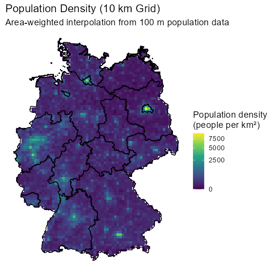 library(exactextractr); library(terra) cell_half <- 50 # Create one template square centered at (0,0) template_square <- matrix( c(-cell_half, -cell_half, cell_half, -cell_half, cell_half, cell_half, -cell_half, cell_half, -cell_half, -cell_half), ncol = 2, byrow = TRUE ) # Extract coordinates of points (vectorized) coords <- st_coordinates(sf_pop) # For each point, add its (x,y) to the template vertices # Create array: [n_points x 5 vertices x 2 coords] verts <- array( data = c( template_square[,1] + rep(coords[,1], each = 5), template_square[,2] + rep(coords[,2], each = 5) ), dim = c(5, nrow(coords), 2) ) # Build polygons (vectorized!) polys <- st_sfc( lapply(1:nrow(coords), function(i) st_polygon(list(verts[, i, ]))), crs = st_crs(sf_pop) ) # Replace geometry efficiently sf_pop_poly <- sf_pop st_geometry(sf_pop_poly) <- polys # derive bounding box from sf_pop_poly bb <- st_bbox(sf_pop_poly) # Create 100m raster aligned to pop cells r100 <- rast( xmin = bb["xmin"], xmax = bb["xmax"], ymin = bb["ymin"], ymax = bb["ymax"], resolution = 100, crs = st_crs(sf_pop_poly)$wkt ) pop_r <- rasterize(vect(sf_pop_poly), r100, field="Einwohner", fun="sum") # should match exactly (aside from floating-point rounding) global(pop_r, "sum", na.rm = TRUE)[1] #> sum #> Einwohner 80324282 sum(sf_pop_poly$Einwohner) #> [1] 80324282 grid_sf$Einwohner <- exact_extract(pop_r, grid_sf, "sum") sum(grid_sf$Einwohner, na.rm = TRUE) #> [1] 80324279 sum(sf_pop_poly$Einwohner, na.rm = TRUE) #> [1] 80324282 # area in km² grid_sf$area_km2 <- units::set_units(st_area(grid_sf), "km^2") |> units::drop_units() grid_sf$pop_dens <- grid_sf$Einwohner / grid_sf$area_km2 # 1. Assign the calculated density back to the original stars object # (This works because grid_sf was created from grid_de with na.rm=FALSE, so the cell order matches) grid_de$pop_dens <- grid_sf$pop_dens grid_masked <- grid_de[shp_de] # 2. Plot the stars object directly ggplot() + geom_stars(data = grid_masked, aes(fill = pop_dens)) + geom_sf(data = shp_de, fill = NA, color = "black", linewidth = 0.5) + scale_fill_viridis_c( name = "Population density\n(people per km²)", trans = "sqrt", na.value = "transparent" ) + coord_sf() + theme_void(base_size = 14) + labs( title = "Population Density (10 km Grid)", subtitle = "Area-weighted interpolation from 100 m population data" )- Redistributes the population from the source polygons (100m cells) to the target polygons (10km cells) based on the proportion of overlap