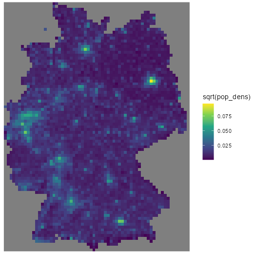 # fill (inside-border) area matrix cells with cell area (10km x 10km) grid_de$area <- st_area(grid_de)[[1]] + units::set_units(grid_de$values, m^2) # fill (border) area matrix cells with intersection cell areas grid_de$area[grid_cross_brdr$ID] <- st_area(grid_cross_brdr) # calculate population density grid_de$pop_dens <- grid_agg_pop$Einwohner / grid_de$area # sanity check est_pop <- sum(grid_de$pop_dens * grid_de$area, na.rm = TRUE) # verify est_pop # 80323301 [1] true_pop <- sum(sf_pop$Einwohner, na.rm = TRUE) true_pop # [1] 80324282 # relative error (true_pop - as.numeric(est_pop)) * 100 / true_pop # [1] 0.001221299 ggplot() + geom_stars(data = grid_de, aes(x = x, y = y, fill = sqrt(pop_dens))) + scale_fill_viridis_c() + coord_equal() + theme_void()- Inside Border: First the cell area (10km x 10km) is calcuated and that value is inserted where values are 0 (cells inside the German border) and not NA (outside border)
