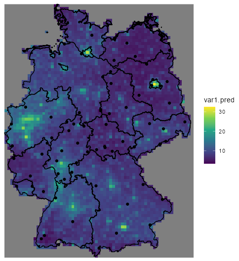no2_krig_univ <- krige(formula = NO2 ~ sqrt(pop_dens), locations = sf_no2_popdens, newdata = grid_de["pop_dens"], model = var_mod_no2) ggplot() + geom_stars(data = no2_krig_univ, aes(x = x, y = y, fill = var1.pred)) + geom_sf(data = st_cast(shp_de, "MULTILINESTRING")) + geom_sf(data = sf_no2) + scale_fill_viridis_c() + coord_sf(lims_method = "geometry_bbox") + theme_void()- Only rural locations were selected, so the data is geographically biased. The model doesn’t having any information about NO2 concentrations in high population density areas, so the NO2 predictions for urban centers follow closely with population density estmates.