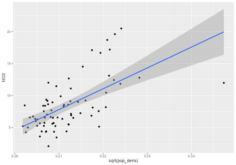 sf_no2_popdens <- grid_de |> select(pop_dens) |> st_extract(sf_no2) |> mutate(pop_dens = as.numeric(pop_dens)) |> filter(!is.na(pop_dens)) |> st_drop_geometry() |> # redundant geometry bind_cols(sf_no2) |> # strips sf class st_as_sf() # adds sf class # no2 vs pop dens ggplot(sf_no2_popdens, aes(x = sqrt(pop_dens), y = NO2)) + geom_point() + geom_smooth(formula = "y ~ x", method = "lm")- grid_de is a stars object which is a list with attributes.