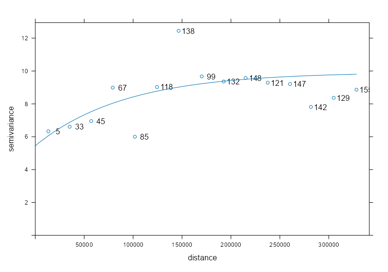 # sample variogram var_samp_no2 <- variogram(NO2 ~ sqrt(pop_dens), sf_no2_popdens) # model variogram var_mod_no2 <- fit.variogram(var_samp_no2, vgm(1, "Exp", 50000, 1)) plot(x = var_samp_no2, model = var_mod_no2, plot.numbers = TRUE)- Outliers at 100K and 150K meters, but otherwise the fit seems decent