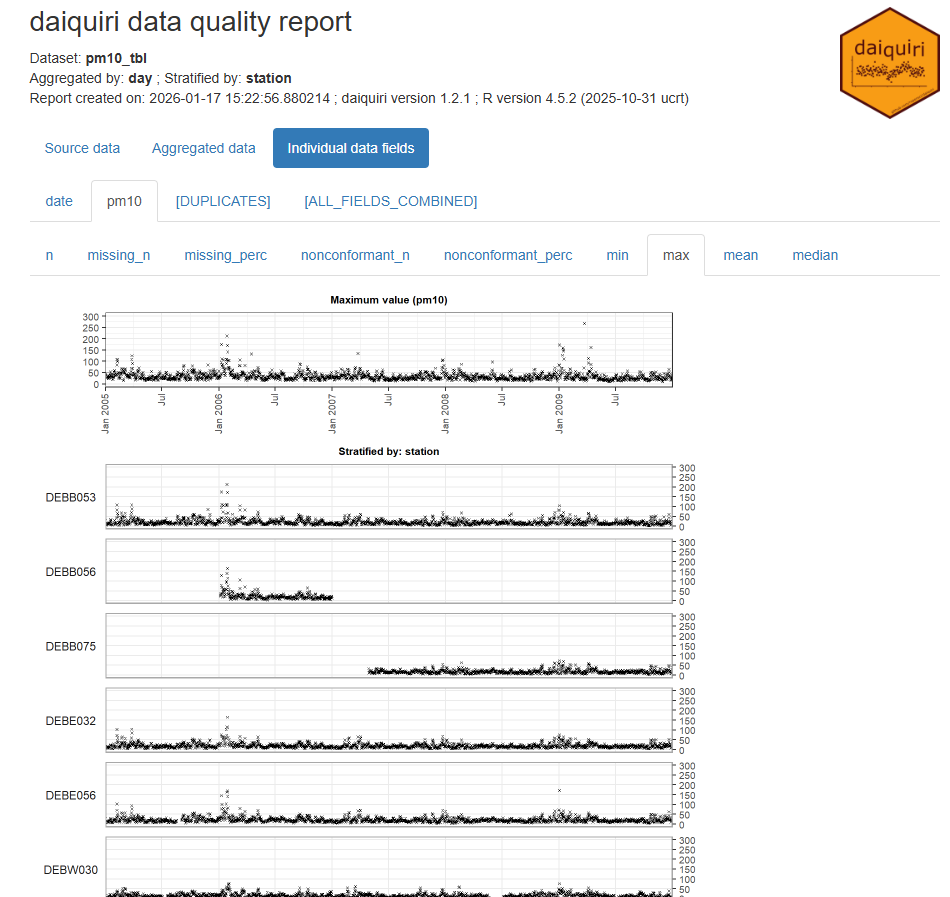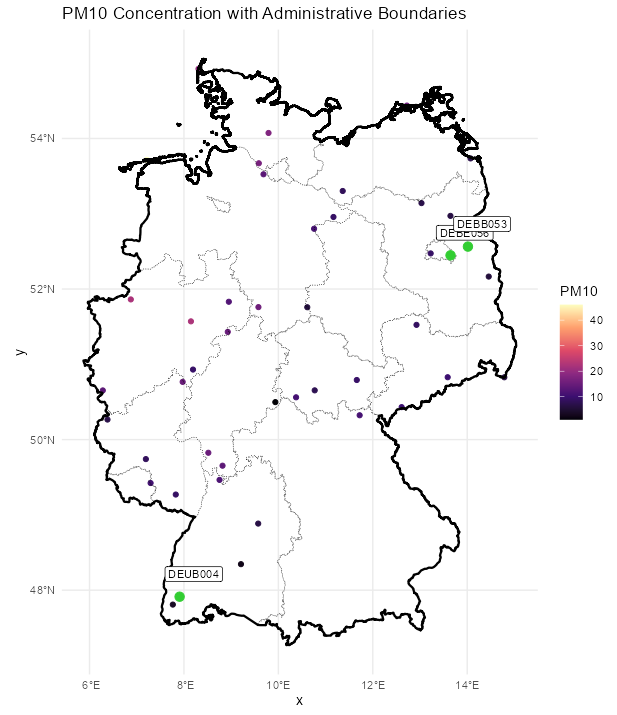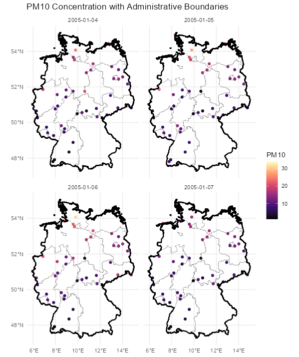 - Further preprocessing steps might be necessary to improve the modelling of this PM10 data set such as for instance a temporal AR-model followed by spatio-temporal residual kriging or using further covariates in a preceding (linear) modelling step.