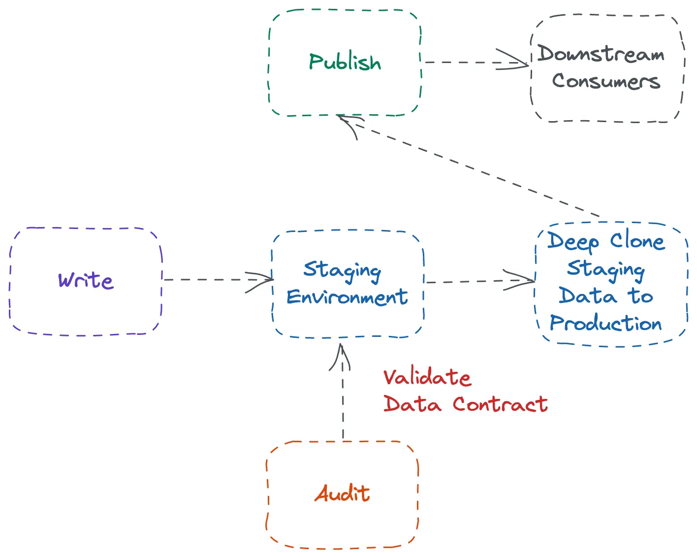 There is a controlled gate where new data is written to a temporary location, audited with quality checks, and only promoted to production if it passes. If it fails, it’s quarantined for review instead of corrupting production.