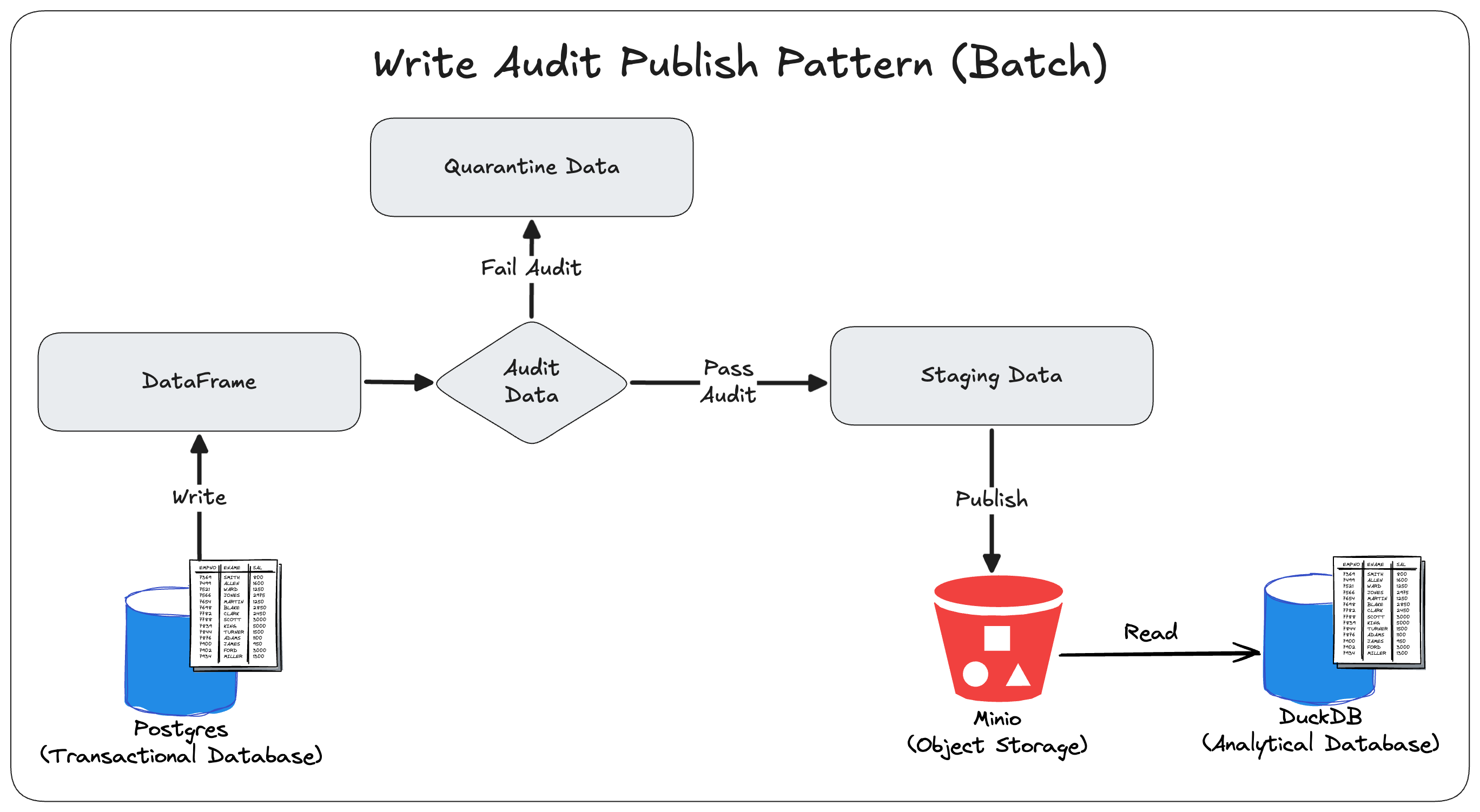 - Data is first extracted and written to a temporary location, then loaded into a dataframe for auditing, and finally written again to the destination after validation.