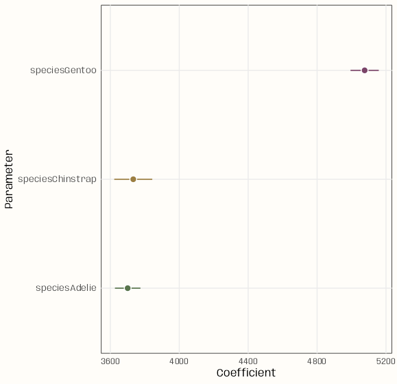 library(ggplot2) library(parameters) notebook_colors <- unname(swatches::read_ase( here::here("palettes/Forest Floor.ase") )) lm(body_mass ~ 0 + species, data = penguins) |> model_parameters() |> ggplot(aes( x = Coefficient, y = Parameter)) + geom_linerange(aes( xmin = CI_low, xmax = CI_high, color = Parameter)) + geom_point( aes(fill = Parameter), size = 3, shape = 21, color = "white") + scale_color_manual(values = notebook_colors[c(4,7,9)]) + scale_fill_manual(values = notebook_colors[c(4,7,9)]) + guides(color = "none", fill = "none") + theme_notebook()library(ggplot2) library(parameters) library(ggdist) notebook_colors <- unname(swatches::read_ase( here::here("palettes/Forest Floor.ase") )) lm(body_mass ~ 0 + species, data = penguins) |> model_parameters() |> ggplot(aes(x = Coefficient, y = Parameter)) + geom_pointinterval( aes( xmin = CI_low, xmax = CI_high, interval_color = Parameter, point_fill = Parameter ), shape = 21, point_color = "white", point_size = 3 ) + scale_color_manual( aesthetics = "interval_color", values = notebook_colors[c(4,7,9)]) + scale_fill_manual( aesthetics = "point_fill", values = notebook_colors[c(4,7,9)]) + guides(interval_color = "none", point_fill = "none") + theme_notebook()