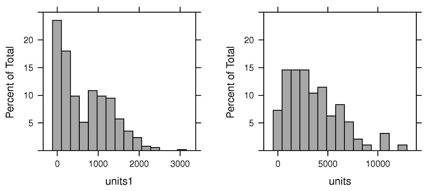 - The use of weights is justified, because tract-level counts of reported housing units underlying the weighted median values vary from 5 to 3,031, and the air pollution model output zone (aggregated geometries using NOX_ID) counts vary from 25 to 12,411. (See histograms)