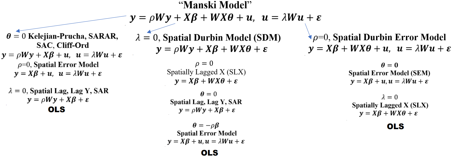 - SDEM (right) nests: OLS, SLX and SEM, but SEM only nests OLS, not SLX.