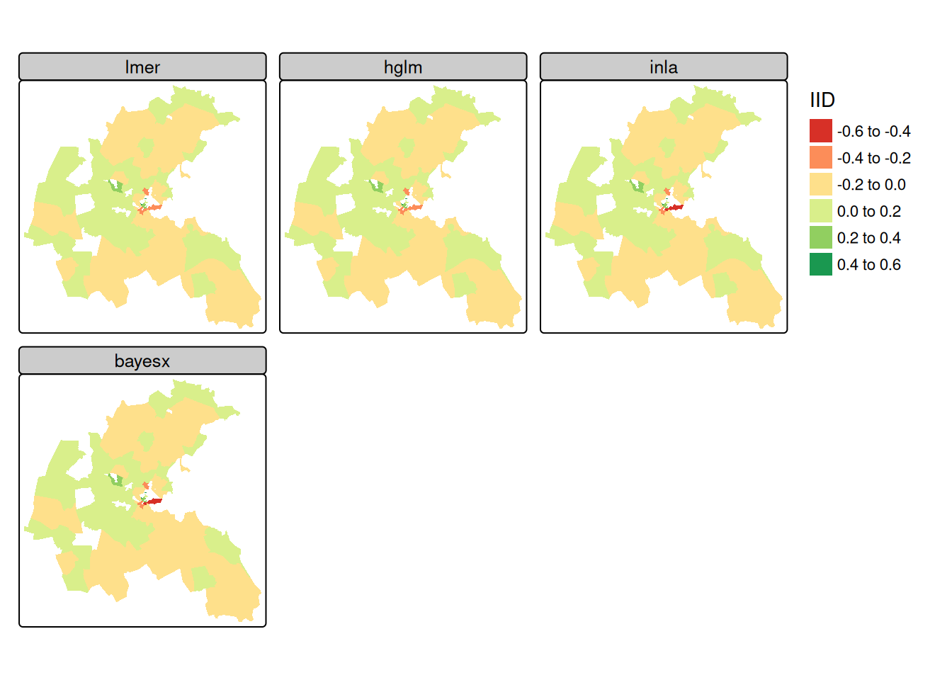 library(tmap) tm_shape(boston_93) + tm_polygons(fill = c("MLM_re", "HGLM_re", "INLA_re", "BX_re"), fill.legend = tm_legend("IID", frame=FALSE, item.r = 0), fill.free = FALSE, lwd = 0.01, fill.scale = tm_scale(midpoint = 0, values = "brewer.rd_yl_gn")) + tm_facets_wrap(columns = 2, rows = 2) + tm_layout(panel.labels = c("lmer", "hglm", "inla", "bayesx"))